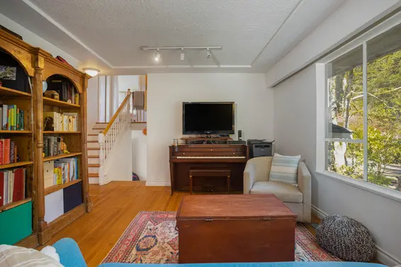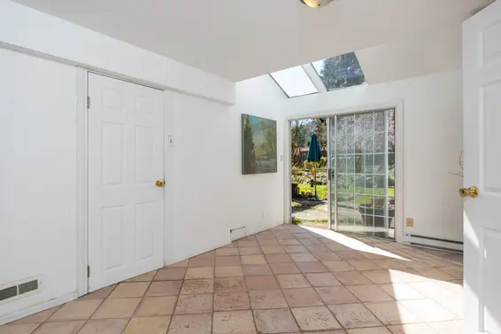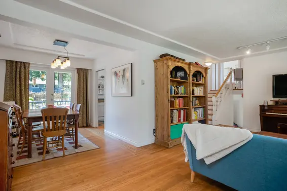 The main level features beautiful hardwood floors throughout the living room and adjacent eating area, highlighted by a large picture window, wood burning fireplace, and French doors providing access to a sun-drenched southwest facing porch great for summer entertaining and barbecues. A bright kitchen with an over-sink window providing views of the back yard completes the main. The upper level of the home offers 3 generous bedrooms, a linen closet, and an updated 4-piece bathroom. The lower level features an authorized 1-bedroom suite with 4-piece bathroom, flex space, and a large open plan layout featuring vaulted ceilings, skylight windows providing tons of natural light, and two sets of sliders to a private outdoor terrace. Completing the home is a converted single car garage featuring a workshop with high ceilings and skylights.