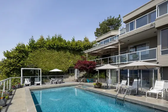 Situated in prestigious Cypress Park Estates, this custom-built one-owner home blends contemporary comfort with stunning ocean views. Expansive living and dining areas, an updated gourmet kitchen, and a family room open to covered decks and landscaped gardens—all overlooking the sparkling pool and sweeping westerly ocean views. The main level also offers a private office and guest suite, while upstairs features five bedrooms with decks, including a luxurious primary with spa-like ensuite. A spacious rec room on the lower level flows directly to the pool and hot tub, creating an ideal setting for family living and entertaining. With a level driveway, oversized double garage, and close proximity to top schools, Caulfeild Village, and quick highway access, this residence truly has it all.