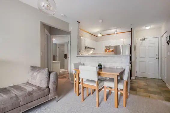 Rarely available garden level suite in the well regarded ‘Windsong at Raven Woods’. Offering 2 bedrooms, 2 bathrooms, and over 800 sq/ft with a well thought out practical floorplan. The kitchen offers plenty of cupboard & counter space with new stainless appliances and opens to the living/dining room with a gas burning fireplace, large picture windows, and access to the partially covered 131 sq/ft patio and garden with a bright west facing exposure. Featuring good bedroom separation and a generous sized main bedroom with a large 8’ x 5’ walk-in closet, full ensuite, and additional sliders to the patio. Completing the space is a large second bathroom with full-size stacking washer/dryer. Awesome opportunity for someone with an active lifestyle and/or pet, with additional townhome style access from the patio. Includes 2 (TWO) tandem parking stalls and a storage locker. Rental and pet friendly complex that offers a club house, well-equipped gym, and bike room. Raven Woods is a welcoming community just a short walk to trails and the beach; a quick drive to Dollarton Village Shopping Center, Deep Cove, Cates Park, and Mount Seymour; and with access to great outdoor recreation including golf, marinas, skiing, and more moments from your door.