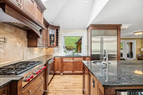 Fabulous Upper Lonsdale traditional home on an estate sized corner lot. The home has been meticulously maintained and thoughtfully updated and is ready for the next owner to move-in and enjoy. Offering 6 bedrooms, 4 bathrooms, and 5,000 sq/ft with a well-designed floor plan that is ideal for family living plus indoor/outdoor entertaining. A generous sized foyer with soaring ceilings and a grand curved staircase greets you upon entering, opening to spacious rooms throughout the 1,800 sq/ft main floor. Featuring a chef’s kitchen with 2 Wolf ovens, Wolf 6 burner gas cooktop (with pot filler), built-in Sub-Zero stainless fridge, wine fridge, extensive cabinets, and a large center island with granite counters. The kitchen leads to a large eating area and adjacent family room that features a gas fireplace with stacked stone fireplace surround, built-in TV, and French doors leading to an extensive covered back patio. The patio is an entertainer’s dream and great for year-round enjoyment with built-in heaters and speakers, thoughtfully placed skylights, and an in-ground hot tub. Completing the main is a formal living room and dining room, a guest bedroom or office, full bathroom, and laundry room (with direct access to the garage). The upper level offers 3 generous sized bedrooms and 2 bathrooms including a spacious primary suite with walk-in closet and spa-like 5-piece ensuite with side-by-side sinks, frameless glass shower, and timeless clawfoot tub. The other two bedrooms are both family-sized and include one with vaulted ceilings and the other with semi-ensuite access. The lower level offers a home gym/recreation room, media room (with drop down projector screen), and a separate self-contained 1 bedroom in-law suite (with a flexible layout to expand the suite to two + bedrooms if desired). Situated on an estate sized nearly 12,000 sq/ft lot with mature, yet easy to maintain gardens. The property features a relatively level driveway to a seldom available 3 car garage with an additional open parking available in the driveway. Additional features include a heat pump (with A/C), gas outlet on the patio, in-ground irrigation, new roof (2023), new hot water tank (2023), extensive millwork, and updated Euro doors/windows throughout. Set prominently on a tree lined street on a quiet cul-de-sac of Upper Lonsdale’s finest executive homes, this property is not to be missed.