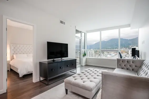 Gorgeous mountain views and convenience at your doorstep with this meticulous 1-bedroom in Central Lonsdale's 'Centreview West'. The largest 1-bedroom layout in the building, the '09 plan feels more like a home with a welcoming entrance way and spa-like bathroom tucked intelligently away from the living space. Featuring A/C and a modern and open living space, highlighted by a gourmet kitchen with gas range, integrated appliances, quartz countertops and backsplash, and breakfast bar seating - great for entertaining. The large living and dining area offers plenty of space for working from home, with floor-to-ceiling windows framing the North Shore mountains. Impressive resort style amenities, including swimming pool, hot tub, gym, steam and sauna room, guest suite and more! Located in the heart of Central Lonsdale with Whole Foods, Shoppers, and countless shopping and dining options within a short walk. Pets and rentals allowed, balance of the 2-5-10 year warranty remaining.