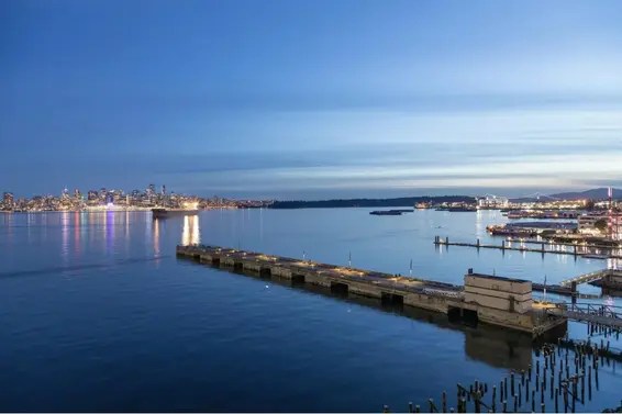 INVESTORS ALERT! Rented at $3200/month until the end of April 2026. BEST 1-BEDROOM VIEW — RARELY AVAILABLE 05 UNIT! This stunning west-facing unit offers 659 SQ.FT with 1 bedroom, 1 den, an ensuite bathroom with separate entrance, walkthrough closet, and a spacious balcony with some of the best ocean views Cascade at the Pier has to offer of the private beach, Vancouver Harbour, Stanley Park and Downtown Vancouver’s breathtaking skyline. Enjoy an open floor plan, gourmet Bosch kitchen with gas stove, integrated fridge/freezer, soft-close drawers, breakfast bar, 9’ ceilings, crown mouldings, A/C, and European finishes. Owners receive VIP Pinnacle Hotel perks: indoor pool, steam room, sauna, jacuzzi, and gym. Steps from Shipyards District, Lonsdale Quay, and endless dining/shopping.