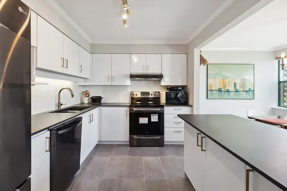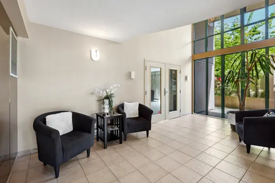 A rarely available patio suite at The Sovereign, located in the heart of Central Lonsdale. This bright and spacious northwest corner home offers 2 bedrooms, 2 bathrooms, and 960 sq ft of well-designed living space—plus an expansive 345 sq ft private patio. The partially open-concept layout is enhanced by large windows and sliding doors that flood the interior with natural light and create seamless indoor/outdoor flow—perfect for summer lounging or entertaining. The patio offers the potential for a private urban oasis, with a planter running the width of the space, room for both a dining set and loungers, and even partial Grouse Mountain views. The interior has been thoughtfully updated throughout, including a modern kitchen with sleek white cabinetry, quartz countertops, timeless subway tile backsplash, and tile flooring. The adjacent dining room is ideally positioned for family dinners or hosting, with sliding doors leading directly to the patio. The generous sized living room includes a cozy nook—ideal for a home office or reading corner. The primary bedroom comfortably fits a king-sized bed with room for added wardrobes, and includes a large closet plus a tastefully updated 3-piece ensuite. The second bedroom is well-suited for family, guests, or as an additional office. An updated 4-piece bathroom and a large laundry closet with stacker washer/dryer and additional storage complete the home. Included are 1 secured parking space and a storage locker. The Sovereign is a well-regarded building in a prime walkable location—steps to City Market, across from an off-leash dog park, and just minutes to Whole Foods, the hospital, Library Square, and an array of shops and restaurants.