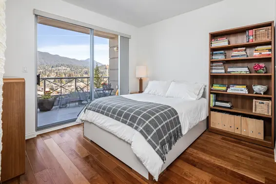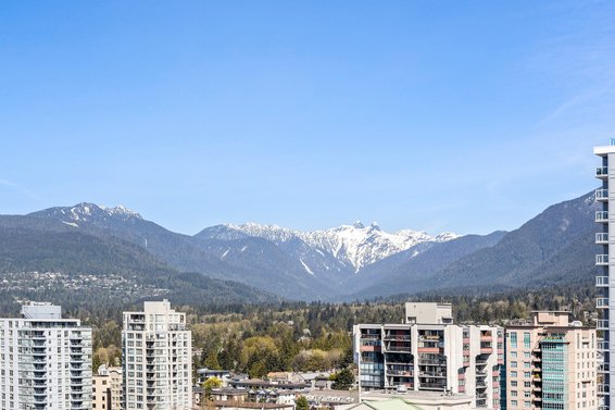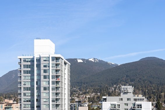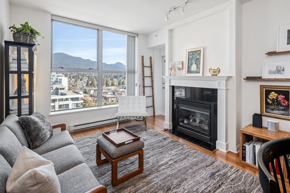 Beautifully maintained 1 Bdrm mountain view condo in the heart of Central Lonsdale. This upper-level unit is on the highest floor possible for a 1 bedroom in the well-regarded Bosa built “The Grande” and features 9' ceilings, floor-to-ceiling windows, a thoughtful open plan with no wasted space, and sweeping views of the North Shore mountains. The kitchen offers granite counters, stainless appliances including a gas range, and a bar stool peninsula. The living/dining rooms are both an ample size and feature a gas fireplace, large picture windows to enjoy Grouse Mountain and Lions views, and access to a partially covered balcony with space for a table & chairs, plus barbecue. Completing the suite is a spacious bedroom with lie-in bed mountain views, sliders to the balcony, and access to the 4-piece semi-ensuite bathroom. Includes in-suite laundry, 1 parking, and a storage locker (with easy access off the lobby level). ‘The Grande’ features a weight room, lounge, workshop, and on-site building caretaker. Awesome central location with a walk score of 87 and all Lonsdale amenities including Whole Foods, restaurants, transit & Lions Gate Hospital steps from your door. Terrific opportunity to move in and enjoy or purchase as an investment.