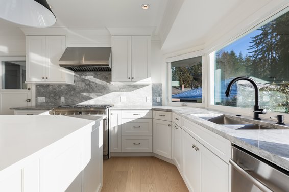 Stunningly renovated ‘Marlborough Heights’ view home. Offering 4 bedrooms, 3 baths, and nearly 3,500 sq/ft on an estate sized 11,712 sq/ft south facing lot with water, sunset, and mountain views. The house was substantially updated with thoughtful additions and quality finishes throughout. The main floor is an entertainer’s dream with an open plan layout and large eclipse doors to a resort-like outdoor space – ideal for indoor/outdoor enjoyment. Featuring a spacious gourmet kitchen with timeless white cabinets, high-end stainless appliances (including a gas cooktop), quartz counters including a centre island, and a walk in pantry. The adjacent dining area is a generous size for family use or entertaining, and offers eclipse doors to the patio. The spacious vaulted ceiling living room features a stacked stone wood burning fireplace, an abundance of windows with lovely views to The Lions, and expansive floor-to-ceiling glass doors that showcase the outdoor space and the sweeping views. The large primary suite offers lie-in-bed mountain views, a large walk-in closet, and a spa-like 5-piece ensuite. Completing the main is a second bedroom, den/office space, elegant 3-piece bathroom, and a laundry room with full size stacking washer/dryer. The lower level offers two additional bedrooms, a large recreation room, a wine cellar, and a games room with built-in bar. The outdoor space has been thoughtfully designed with mature, manicured gardens and expansive deck space including an 800 sq/ft patio off the main and a fully glass fenced pool space. Situated on a corner lot with an abundance of parking including a parking pad off the front and side access to a detached two-car garage. Additional features include air-conditioning, built-in speakers, designer light fixtures, quality engineered hardwood floors throughout the main, and a motorized cover for the pool/hot tub. Located in a rarely available, sought after family neighbourhood just a short walk to schools; close to Carisbrooke and Delbrook Parks; near Delbrook Community Recreation Centre; and with easy access to all Lonsdale, Westview and Edgemont Village amenities. Truly a trophy property that must be seen.