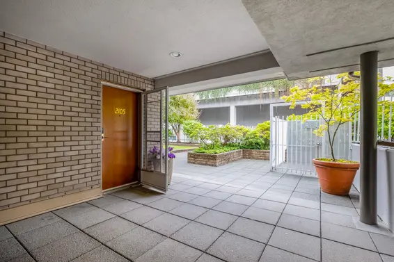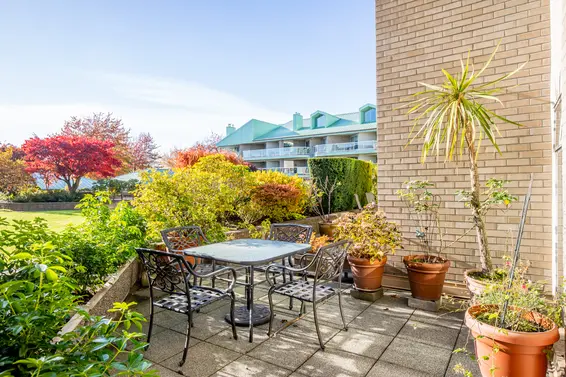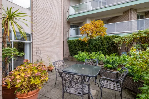 Renovated, south facing courtyard level 1 Bdrm suite in the semi-waterfront ‘Harbourview Park’. Great opportunity for a first-time buyer or downsizer, offering over 850 sq/ft with generous sized rooms throughout. The spacious living room features a cosy gas burning fireplace with stacked stone surround, plus sliders to the south facing patios. The fully renovated kitchen includes tasteful quartz counters, gleaming white cabinets, and stainless appliances. The adjacent dining area features plenty of room for entertaining. Completing the home is a cheery south facing bedroom with thoughtful built-in closet organizers, 5-piece bathroom with his-and-her sinks and tub with frameless glass door, and a large laundry/flex space, great for a potential den or as in suite storage (currently utilized for storage with custom built-in shelves). Featuring terrific outdoor space with two patios, one partially covered, and the other overlooking the common courtyard. Updates include new flooring throughout; new kitchen cabinets, counters, and backsplash; renovated bathroom; and pot lights – all done with strata approval and required permits. The suite is well located in the complex, securely on the gated main level, yet with convenient access to walk to shops and restaurants without sharing an elevator. Includes 1 secured parking stall and a storage locker. Harbourview Park is a well-regarded owner occupier complex, 1 cat is allowed, and with terrific underground visitor parking. Great Lower Lonsdale location with all amenities at your doorstep – on the Spirit Trail, next to Waterfront Park, and steps to the Lonsdale Quay, Shipyards, and transit.